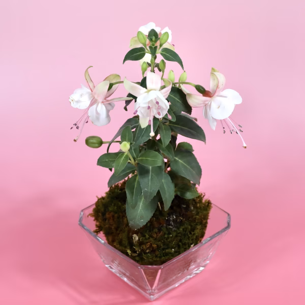 別名「貴婦人のイヤリング」と呼ばれるフクシアと、高野山麓で採取しまし這苔を使った苔玉です。