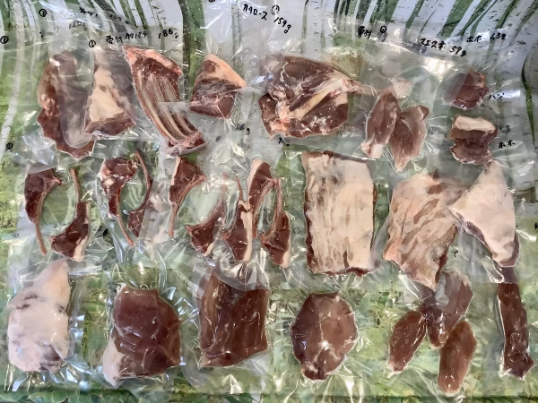 品種特徴:子イノシシオスの15kgということで、肉質は柔らかく、子イノシシのためジビエ独特の野獣臭はほとんどありません。
