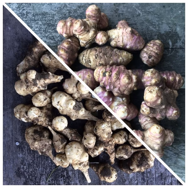 こちらは、一般的な白菊芋と、さらにイヌリンなど栄養素が豊富に含まれると言われるフランス菊芋(赤紫菊芋)のミックスになります^^;