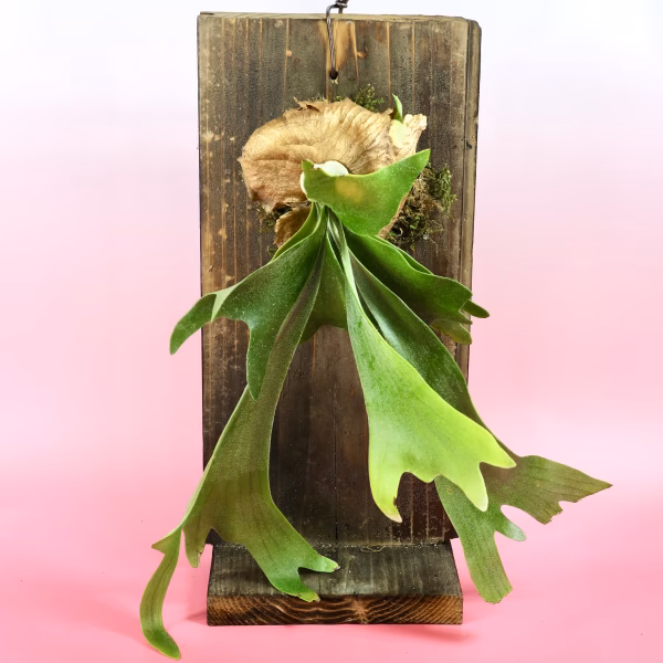 ▼商品概要  熱帯地域に生息する着生植物です。 手前の長い葉は胞子葉、 板付き部分の外套葉の二種類の葉を持ちます。 外套葉は貯水葉とも呼ばれ、その名の通り水を蓄える事が出来ます。 立てかけて、壁掛けにしてお楽しみ下さい。 個体差により葉の大きさや形が変わります。 ▼栽培/生産方法、こだわり 自家製板に当店で着生させています。