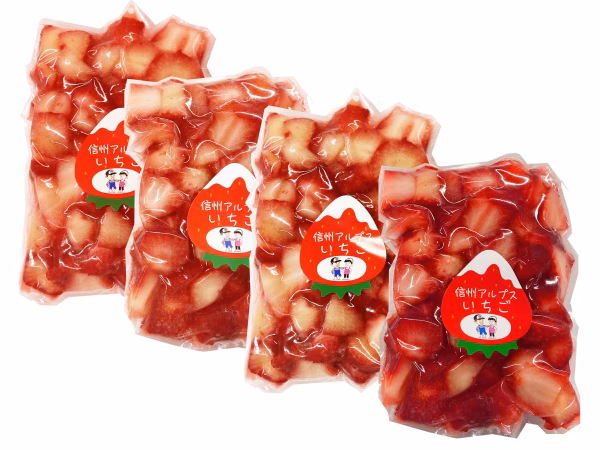 完熟のイチゴのみを早朝に収穫後、すぐに選別し真空パックし冷凍しております。