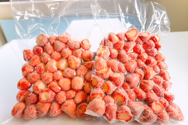 いちごの最適な環境にするためしっかり換気をすることで病害虫の発生を抑制します。元肥追肥に菌源炭をたくさん使用することで水も浄化します。直接、店頭販売するため安心で安全ないちご作りを心がけています。また急速冷凍機にて冷擁しているため、凍結スピードが速くいちご内の水分が凍る温度帯を素早く通過させることができる為氷の水晶の成長を抑制し細胞破壊を限りなく防ぐことができます。いちごの細胞を破壊しないので鮮度、風味、食感を維持することができ冷凍前の美味しさ、品質を解凍時に再現することができます。