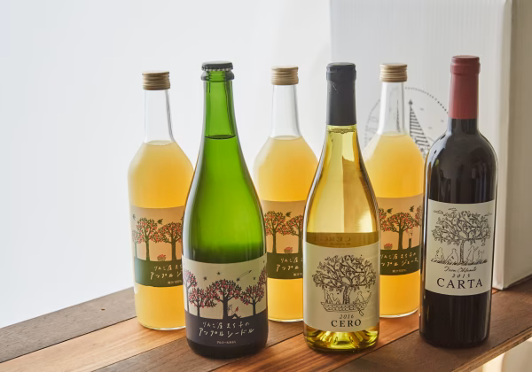 岩手県陸前高田市の米崎りんご。その中の希少な老木からのりんごも使った「アップルシードル」。それに甲州白ワイン、マスカットベリーAの赤ワイン、アップルジュースをセットにしたギフトとなります。