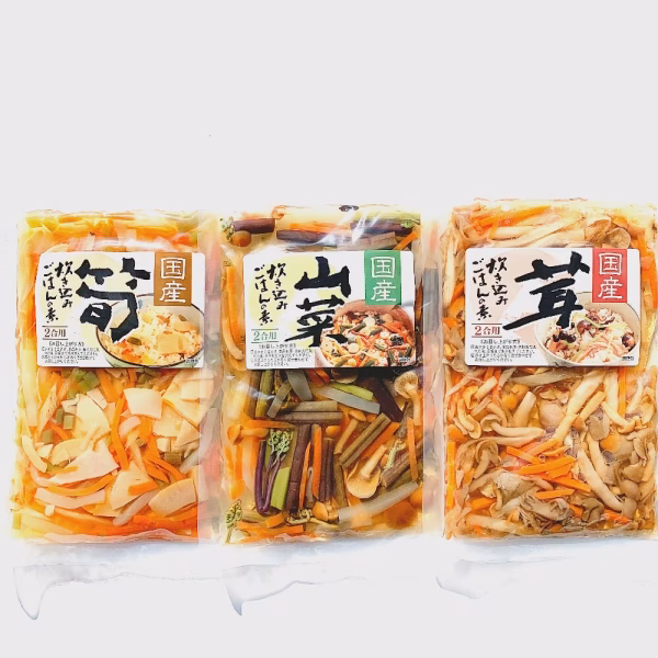 - <たけのこごはんの素> 孟宗竹・こんにゃく・人参・ごぼう・みず・醤油・食塩・アミノ酸・発酵調味液・クエン酸(一部に大豆・小麦を含む) <きのこごはんの素> ぶなしめじ・まいたけ・なめこ・人参・ごぼう・醤油・発酵調味液・食塩・アミノ酸・クエン酸(一部に大豆・小麦を含む) <山菜ごはんの素> わらび・なめこ・こんにゃく・人参・醤油・発酵調味液・アミノ酸・クエン酸(一部に大豆・小麦を含む)