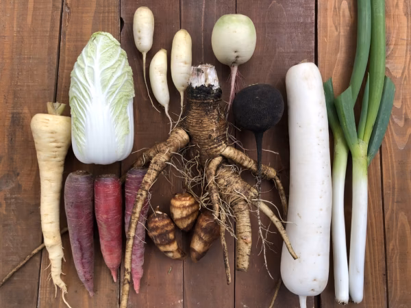 - 12月は、白菜・ネギ・大根色々・カブ・ニンジン・パースニップ・里芋・ゴボウが基本の品目となります。