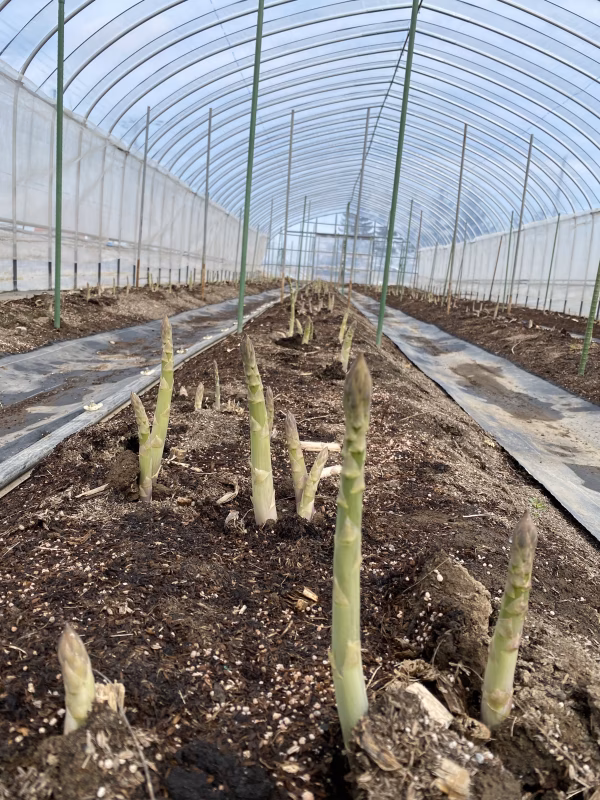 ガリバーと言う品種で3年目より太いアスパラが伸びてきます。秋にビニールを外し雪の下にし春の雪解けを待って出てきたアスパラは甘味があり瑞々しいです。