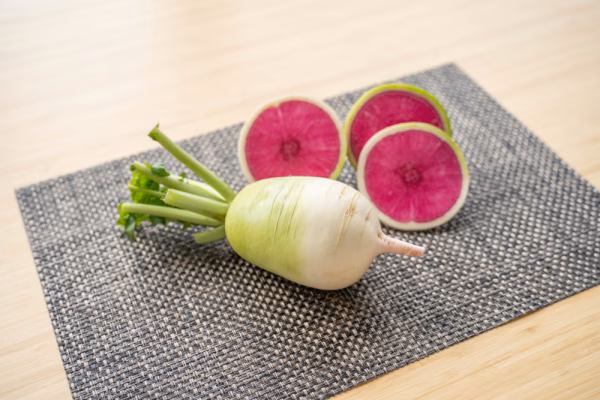見た目がカブに似た大根なのですが、中身は紅色の綺麗な色をした大根になってます。なかなか流通のない貴重な一品です!