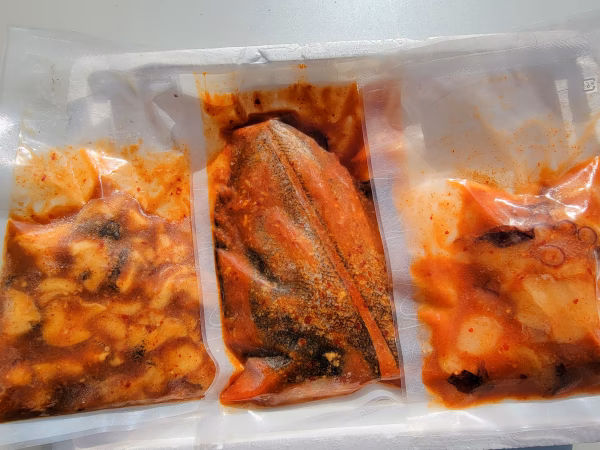 水タコは半生ボイルしているので瑞々しく酒の肴にもバッチリです。 キムチ宗八鰈の方は湯煎で15分。 タコキムチ&ツブキムチは解凍後、そのまま食べられます。