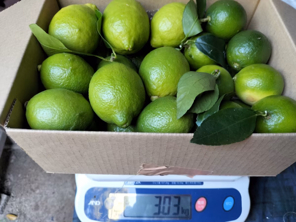 緑黄色レモンは約15個ライム約6個前後のセットになります。※容量約3㎏には箱,包材等を含みます。