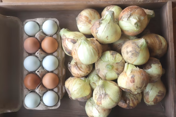 新玉ねぎは、保存向きではありませんが少し置く場合は冷暗所か冷蔵庫に保存してください。たまごは、生食は賞味期限内に、期限後は十分に加熱してお召し上がりください。