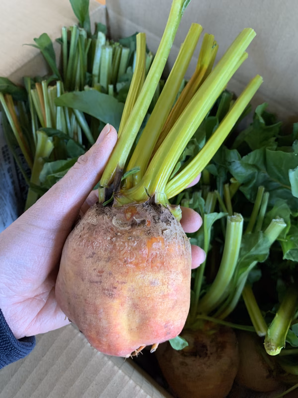黄色い太陽のようなビーツ ルナ10個前後を、箱に詰めてお届けいたします。