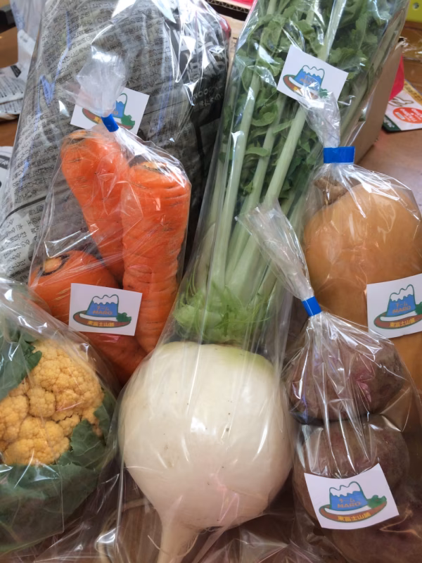 大根、蕪、紅大根、白菜、人参、ケール、大根葉、水菜、小松菜、里芋、馬鈴薯、完熟南瓜、鷹の爪、根生姜など