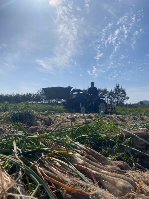 60年間、3代続くらっきょう農家です。自家採取の種を用い、1粒1粒を丁寧に育てています。東シナ海から吹き上げる北西の風の特性を活かした栽培方法が、色白で大粒のらっきょうを作り出します。