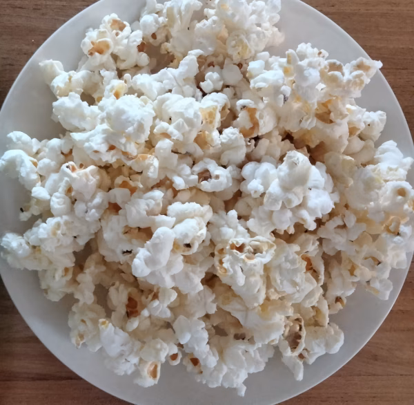 写真は50gで20cmのお皿山盛りのポップコーンが出来ます