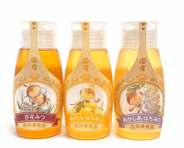 大事に丁寧に採った自慢の百花蜂蜜と、熊本の豊かな大地と水が育んだみかん畑から採ったみかん蜂蜜と、青森までミツバチたちを連れていき、白いあかしあの花から採った、あかしあ蜂蜜の3本セットです!