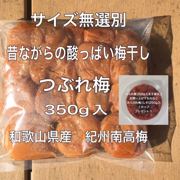 只今、数量限定(10カップ)でつぶれ梅350g入を2袋以上お買い上げの方に、もれなく大つぶれ梅(しそ漬梅)250g入1カップをプレゼントしております。