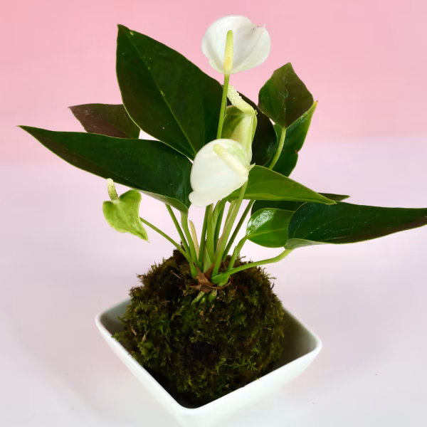 ほっそりスタイリッシュなアンスリュームと高野山麓で採取しまし這苔を使った苔玉です。