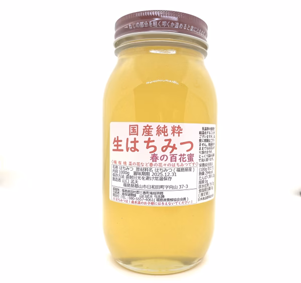 【百花蜜】とは特定の花の蜜(アカシアなどの単花蜜)ではなく、山野に咲く多種の花々から出来るはちみつで季節や場所によって様々な蜜色や風味がございます。 【春の百花蜜】 当養蜂【滝桜湖養蜂】は福島県田村郡三春町の国の天然記念物『三春滝桜』の近くで親子2代約30年ほど養蜂を営んでおります。周囲には梅、花桃、桜の樹木が至る所にあり、また菜の花や藤の花、山桜なども多く自然豊かな環境です。春の百花蜜はこれらの花々の蜜からなるはちみつで、クセが無くさわやかな香りとすっきりとした後味のはちみつです。 【当養蜂のこだわり】  当養蜂のはちみつは採蜜機(遠心分離機)にて蜜の溜まっている貯蜜枠よりはちみつを分離抽出し蜜こし網で巣片などを取り除き、そのはちみつを一つ一つ手作業で瓶詰めしております。また、当養蜂のはちみつは採蜜後〜瓶詰め出荷まで余計な熱を加えていない【そのままのはちみつ=生はちみつ】になります。 【おすすめの食べ方】 はちみつは熱を加えるほどに栄養成分が失われると言われています。 生はちみつの持つ豊富な栄養を充分に摂取して頂くためにも、なるべく熱を加えないでお召し上がり頂くことをおすすめ致します。 ※はちみつは一歳未満のお子様には与えないでください! ◎ご希望の組合せ、まとめてのご購入など対応できますのでお気軽にお問合せ下さいませh! ▼数量、分量の目安 内容量は1000gとなります。 ▼栽培/生産方法、こだわり ▼注文に際しての注意点(配送方法や納期指定など)