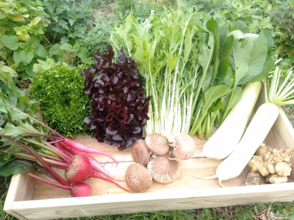 お野菜の品目例:小松菜、水菜、ケール、レタス、キクイモ、さつまいも、大根、かぶ、玉ねぎ、原木椎茸など