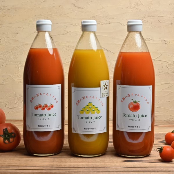 - <大玉トマトジュース> 大玉の「八百ちゃんトマト」をふんだんに使ったトマトジュースです。 1,000mℓのジュースの中に、大玉トマトが約12個も入った、100%ストレートの超贅沢なジュース。 果肉のある大玉を使っているので若干ドロッと感がありますが、トマトジュースが好きな方には喜ばれる商品です。 『そのまんまトマトを飲んでる感じ』との感想をよく聞きます。 毎朝そのまま飲まれる方もいますが、ビールや焼酎で割って飲むことで、次の日に残りにくい飲み方をされる方もいます! 【原材料名】大玉トマト【姫路市産】 【栄養成分表示(100gあたり)】 エネルギー 17kcal、たんぱく質 0.7g、脂質 0.1g、炭水化物 4.0g、食塩相当量 0g <中玉トマトジュース> 「八百ちゃんトマト」の中でも最も濃厚な中玉トマトをふんだんに使ったトマトジュースです。1,000mℓのジュースの中に、中玉トマトが約60個も入った、100%ストレートの超贅沢なジュース。 大玉よりも果肉が少ないため、さらっと飲みやすいトマトジュースです。 手土産やギフトによく選ばれる商品です。 【原材料名】中玉トマト【姫路市産】 【栄養成分表示(100gあたり)】 エネルギー 17kcal、たんぱく質 0.7g、脂質 0.1g、炭水化物 4.0g、食塩相当量 0g <イエロミニトマトジュース> 「八百ちゃんトマト」の中でも最も甘いイエローミニトマトをふんだんに使ったトマトジュースです。1,000mℓのジュースの中に、イエローミニトマトが約80個も入った、100%ストレートの超贅沢なジュース。 珍しい商品で、もちろん満足度も高いため、手土産などギフトに喜ばれるという理由でよく選ばれる商品です。 【原材料名】イエロミニトマト【姫路市産】 【栄養成分表示(100gあたり)】 エネルギー 17kcal、たんぱく質 0.7g、脂質 0.1g、炭水化物 4.0g、食塩相当量 0g ※栄養成分表示の数値は日本食品標準成分表を用いて計算した推定値です。