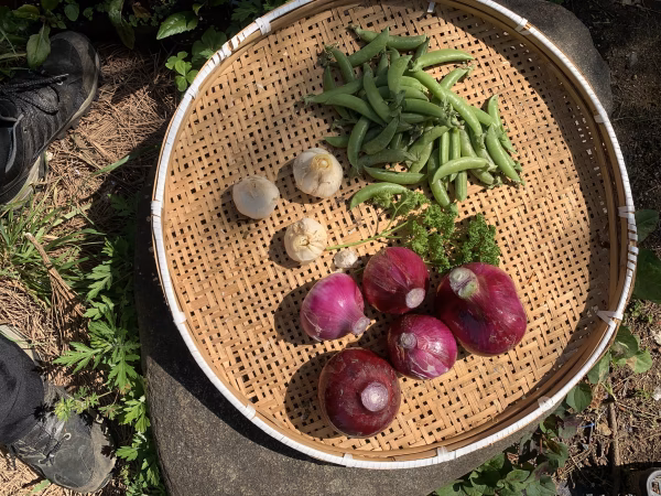 写真を参考にされてください、赤タマネギ5〜6個ほどニンニク3個ほどスナップエンドウ600グラムほどパセリ2〜3本ほどパクチー70グラムほど、ズッキーニは2本です。