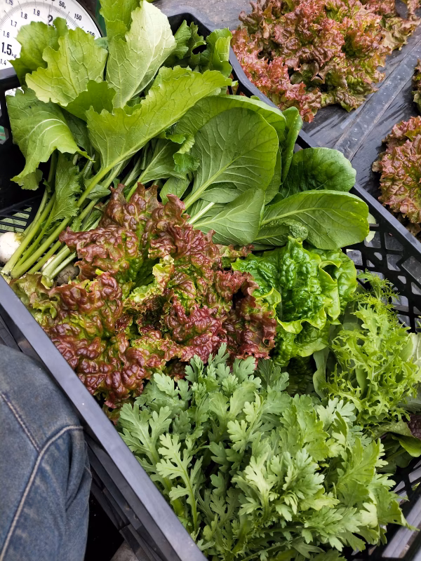 カラフルなサラダ用葉物ミックスやリーフレタス、コカブなどを詰め込みます。