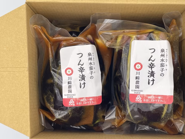 今までのつん辛漬けより、厚切りになりつーんとくる辛さはそのままなのに水なすの旨さが味わえるようになり、1袋当たり泉州水なすを1房まるまる使っています。