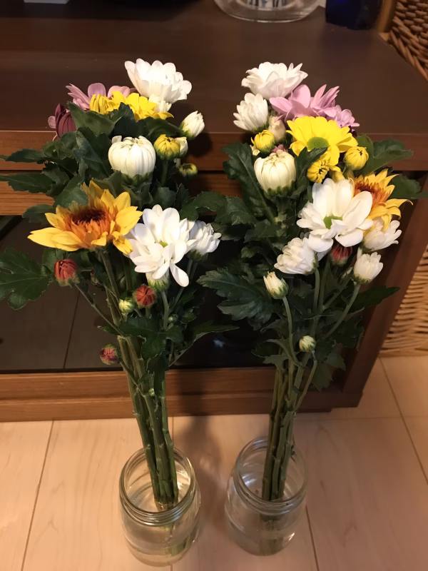 輪菊2本、スプレー菊5本を1束にし、2束1対でお送り致します。