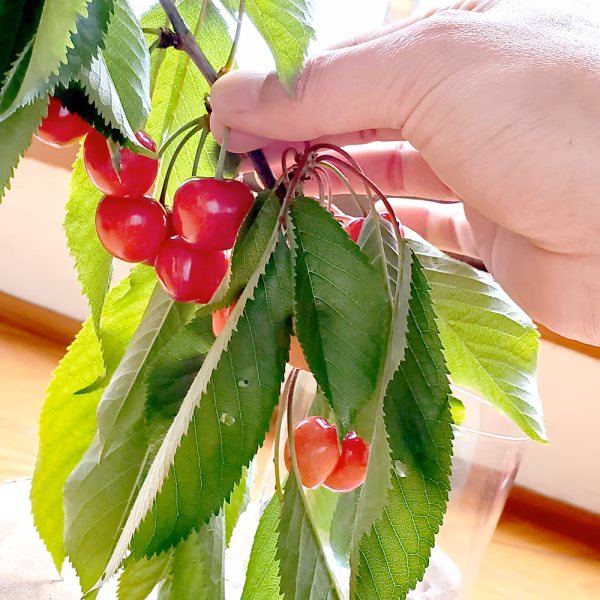 - 枝付きさくらんぼを飾る場合は枝の下部にある葉っぱや実を切って水差しをして日当たりの良い場所に置くと葉が少し元気になっていきます。