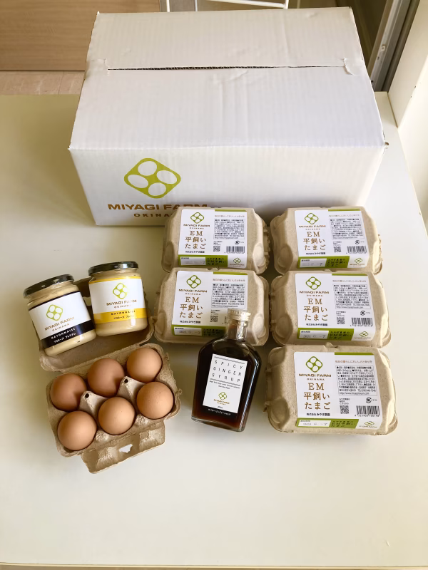 平飼い卵6個入×6パックとマヨネーズ大瓶2本(プレーンとプレミアム)、スパイシージンジャーシロップ1本をセットにしました。