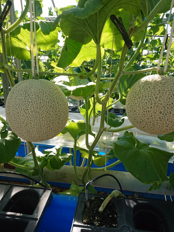 アローマ、クラウンメロンと同じスリークォーターのガラス温室で栽培しています。
