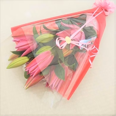 白根地区で栽培されているユリの多くはオリエンタルハイブリットというグループで、色は白系・ピンク系が主流です。花が大きくとても豪華で少し強めの香りがあります。花持ちがするのであったかくなってきた季節の贈り物にも適しています。