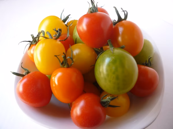 赤、黄色、オレンジ、紫、緑、茶と様々な色と形のトマトを5~8種類入れてお届けします。