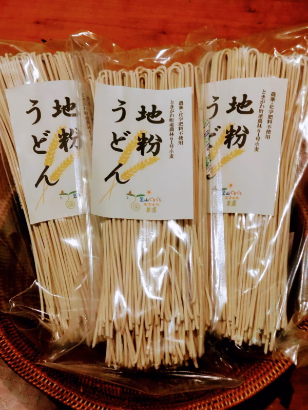 埼玉県比企郡ときがわ町で育った自然栽培の小麦粉(農林61号)に、塩(シママース:沖縄の塩)のみを加えたとってもシンプルな乾麺うどんです。
