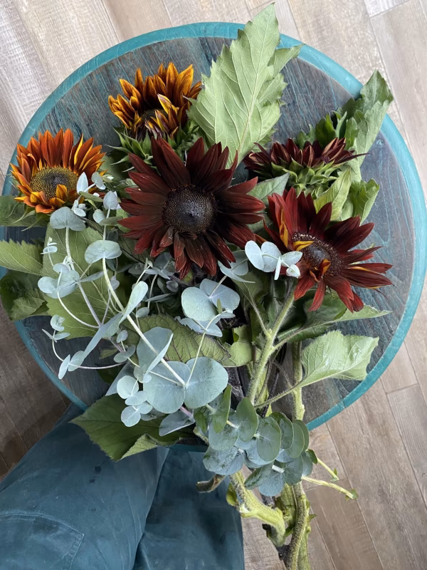 品種・色・本数はお選びいただけませんが、希少チョコレート色のひまわりを5本お届けします。