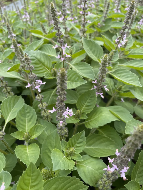 茎も葉も緑色、花は薄い紫色のホーリーバジルと
