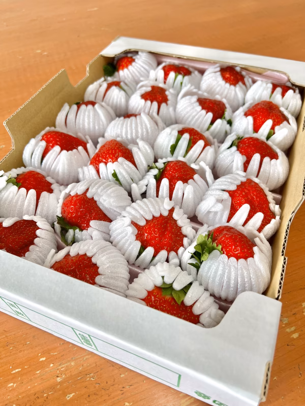 輸送時にイチゴが傷まないようにアコーディオン型のフレシキブルトレーを使用してお送り致します。