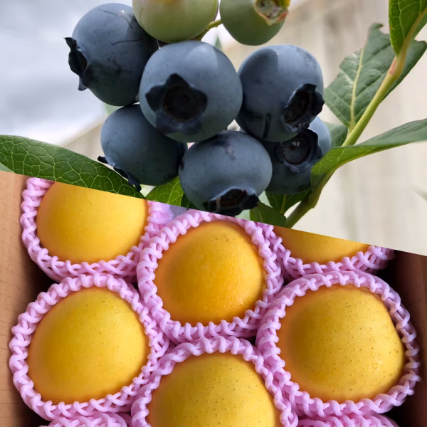 朝、園主の母上が朝露の中収穫して来たブルーベリーをパックに詰めて、大人気のスマートフレッシュ加工のシナノゴールドと詰め合わせてお届け致します‼️