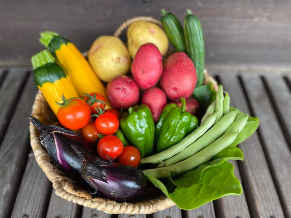 玉ねぎ、つるむらさき、ニンニク、じゃがいも(レッドムーン、デジマ、キタアカリ、メークインのいずれか),大玉トマト(れいか・桃太郎)、フルティカ、ズッキーニ、トウモロコシ、きゅうり、ピーマン、甘とうがらし、空心菜、モロヘイヤ、枝豆