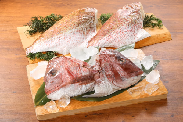 みやび鯛の皮つき半身(2P)と頭(半分カット)のセットです。