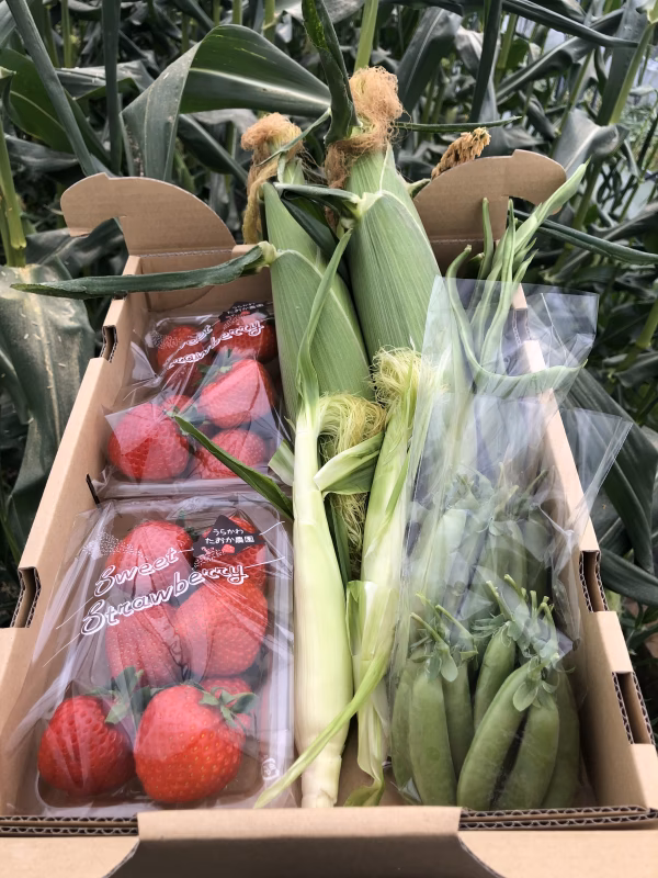 1箱イチゴ2パック、ミニトマト(ほれまる)5〜10個、インゲン5〜10本、スイートコーン(ロイシーコーン)、長茄子等(イチゴ以外は季節により変わります)