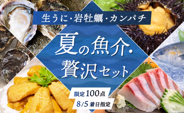 このセットでは、大人2人でお楽しみいただける贅沢な海鮮料理が楽しめます。例えば、大きな岩牡蠣は2個ずつ、カンパチの刺身は1回分、そしてたっぷりのうにを乗せた丼など、贅沢な食事の時間をお過ごしいただけます。夏のご褒美としてぜひお試しください。