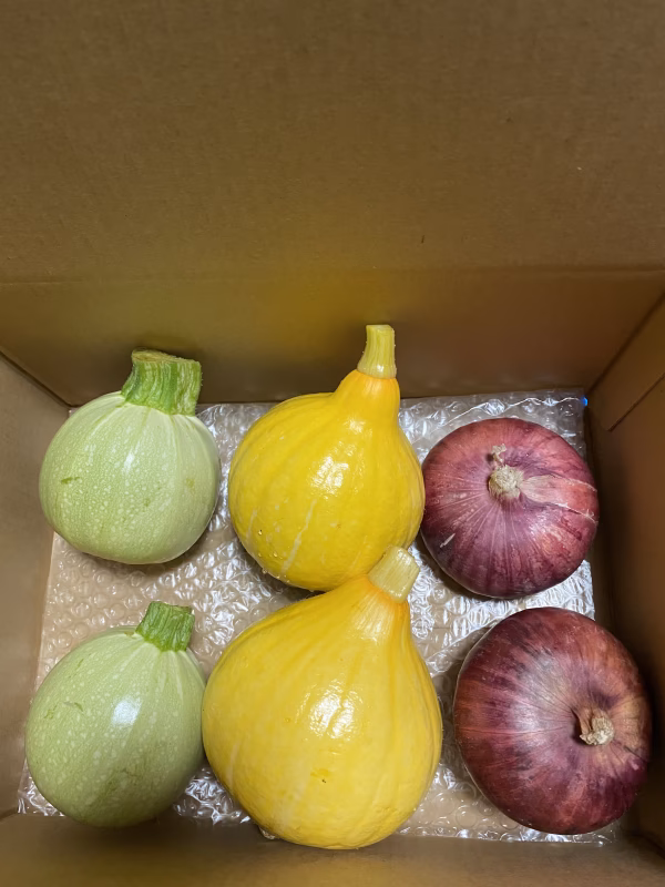 - コリンキー、丸ズッキーニは冷蔵庫の野菜室へ。レッドオニオンは冷暗所で保管して下さい。