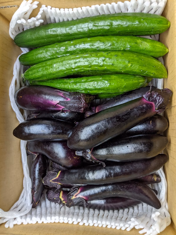 長ナスとキュウリを箱に満帆詰めしております。
