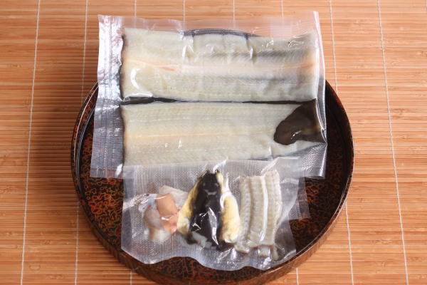 調理しやすいように、「身」と「頭+中骨+内臓」に分けて真空パックしております。内臓の胆のう(苦だま)は除去済みです。