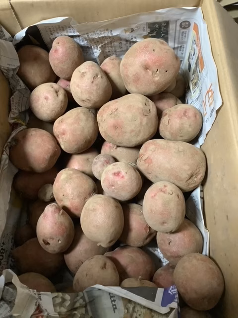 ▼アンデスレッド。ホクホクとした食感の赤皮ジャガイモ。中は黄色で、コロッケやポテトサラダに好適です。