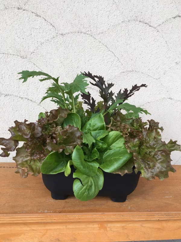 🐢かめっこ農園の生きてるサラダをどうぞ~🐢 「畑の採りたてのレタス美味しさをを、いろんな人に味わってもらいたい。」 そんな願いで生きてるサラダの寄せ植えを作りました。  こちらの商品は3~5種類のレタス6株と2種類の水菜2株を寄せ植えにしました。のんびり育てつつ新鮮サラダが楽しめます。  鉢の大きさは縦23㎝×横32㎝×高さ14cmです。葉を入れた全体の大きさは縦約40cm×横約50cm高さ約35~40cmです。  彩りにちょと葉物が欲しい時、パンにはさんで食べたい時など便利です。 見た目も花の寄せ植えのようで、レタスのふわふわ感は眺めていると癒されます。レタスの華やかさと珍しさで、贈り物にも。 畑がない方にも気軽に野菜を育ててもらい、自然を感じる豊かな時間を感じてもらえればいいなあと、自分たちも楽しみながら作っています。小さなお子さんと一緒に育ててみるのも楽しいですよ。  鉢の土は、市販の培養土と発酵肥料そして草木などで作った自家製の土が入っています。地元の木や草を利用しました。もちろん無農薬です。  水やりと日当たりや温度、葉の摘み方に気をつけてもらえば、1か月以上も楽しんでいただけます。株が大きくなってきたら、植え替えてもらっても楽しめます。レタスと水菜は、気長に待っていれば中心から葉を出してくれるので、その生命力も感じてみてください。  育て方のしおりはつけます。困ったことやわからないことがあれば、こちらの投稿欄やメッセージでどうぞお尋ねください。  生きてる野菜のパワーをどうぞ😋♪  ※梱包資材代300円を代金に追加させていただきました。