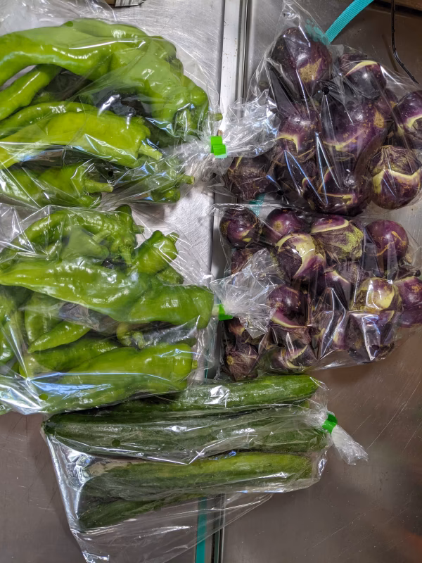 丸ナス2袋、アマトウガラシ2袋、キュウリ1袋の詰め合わせです。