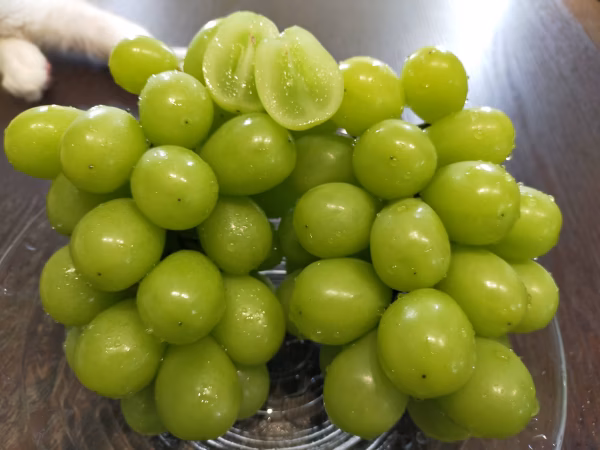 ▼商品概要 朝収穫その日の午後発送のシャインマスカット ▼品種・味の特徴 種無しで皮ごと食べられます。甘さと酸味がバランスしてパクパク食べられます ▼数量、分量の目安 0.9Kg、2房相当 ▼栽培/生産方法、こだわり 減薬栽培、南国鹿児島産のシャインマスカットです ▼注文に際しての注意点(配送方法や納期指定など) 配送はヤマトのクール宅急便、納期の指定はできません。