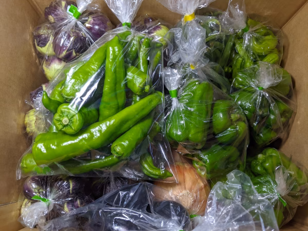丸ナス6袋、インゲン2袋、シシトウ1袋、ピーマン3袋、アマトウガラシ1袋、玉ねぎ1袋の詰め合わせです。